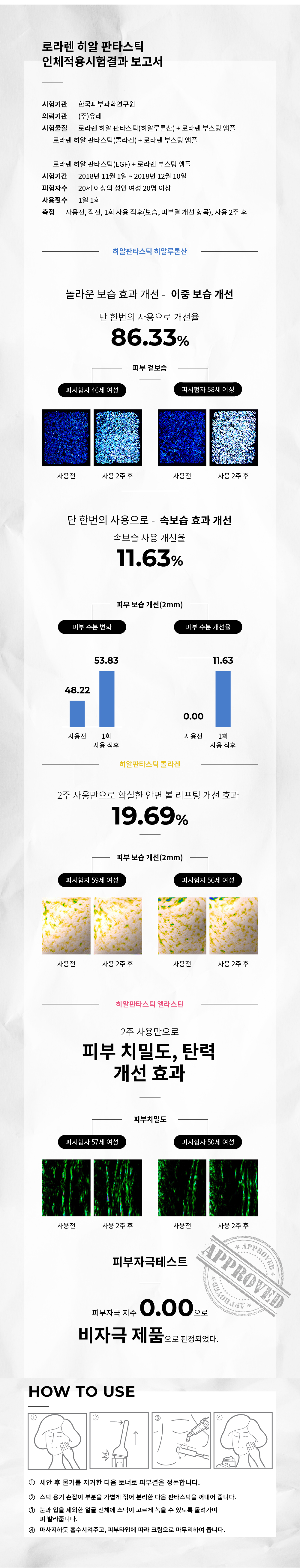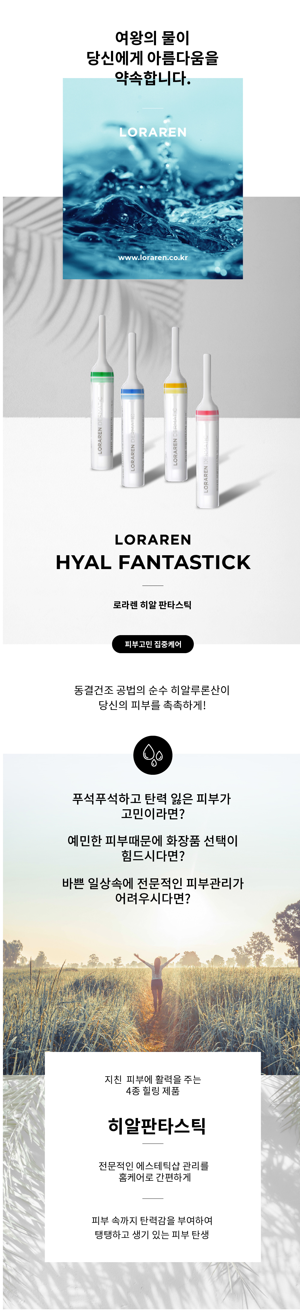 동결건조한 히알루론산이 피부 깊숙이 채워 수분 가득 촉촉한 피부결로 완성. Hyaluronic acid freeze-dried ampoule, a water magnet. It acts as a moisture filler between collagen and elastin and has an ingredient that preserves more than 1,000 times its weight.(Limited to raw material characteristics)
